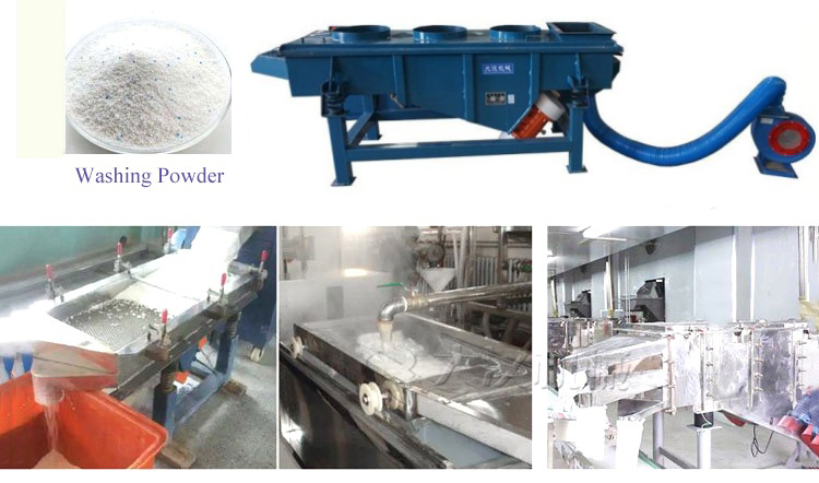 大漢機(jī)械降溫直線振動(dòng)篩這對高溫特性物料設(shè)計(jì)研發(fā),可在有效降低物料溫度后再對物料進(jìn)行篩分,有效的提高了篩分效率及處理量,下面以洗衣粉為例說明風(fēng)冷式振動(dòng)篩的應(yīng)用。洗衣粉在剛剛完成生產(chǎn)后,通常為120度左右的高溫,如不進(jìn)行降溫處理,篩選分級(jí)非常困難,而洗衣服不適合傳統(tǒng)的水冷式降溫。在洗衣粉生產(chǎn)線上用“大漢牌”風(fēng)冷式直線振動(dòng)篩,剛生產(chǎn)完成120度高溫洗衣粉通過輸送設(shè)備直接進(jìn)入風(fēng)冷式直線振動(dòng)篩,經(jīng)過安裝在設(shè)備進(jìn)料口底部的風(fēng)機(jī)降溫冷卻系統(tǒng),(不符合要求的結(jié)塊物料通過安裝在進(jìn)料口端的篩網(wǎng)篩選后從出料口旁的小型排料口排出,見下圖,該裝置可根據(jù)物料特性選裝),可直接將洗衣粉溫度降至40-50度后再進(jìn)入直線振動(dòng)篩完成篩選分級(jí)工作。